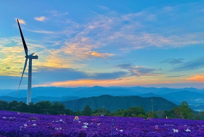 넓은 산 정상에 세워진 하얀 풍력발전기는 멀리서 보면 마치 거대한 바람개비가 돌아가는 듯한 모습입니다. 바람이 불 때마다 천천히 회전하는 풍력발전기의 모습은 자연과 기술이 어우러진 독특한 풍경을 만들어 냅니다. 특히 해질 무렵 노을이 질 때 풍력발전기와 붉은 하늘이 어우러진 장면은 많은 사진작가들이 찾는 촬영 명소이기도 합니다.